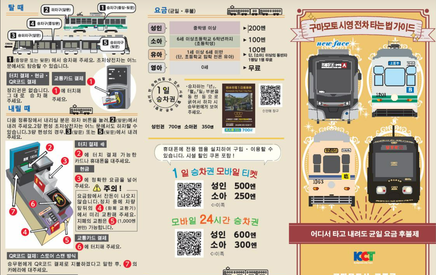 1) 구마모토 교통패스를 정리해보면 한번 탈때 대인 200엔, 소인,유아 100엔이다.